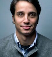 A bustling urban street scene featuring a tram, bus, and several cars moving along a narrow road lined with historic buildings. The cobblestone pavement has railway tracks embedded into it, and there are several pedestrians on the sidewalks. A traffic light signals green, and a road sign indicates a forward direction.